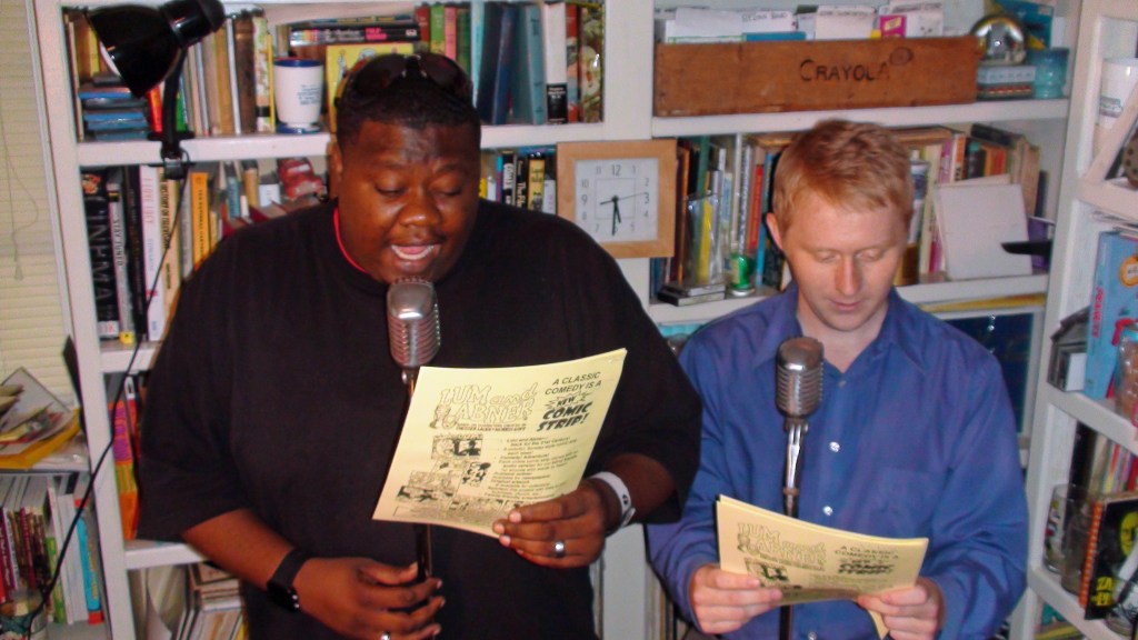 In this photo, they’re speaking into vintage Shure 55S microphones – the same ones used for 20 National Lum and Abner Society Conventions. See the Sunday, May 2, 2021 Lum and Abner comic strip for photos of the celebrities who have spoken into these mics!