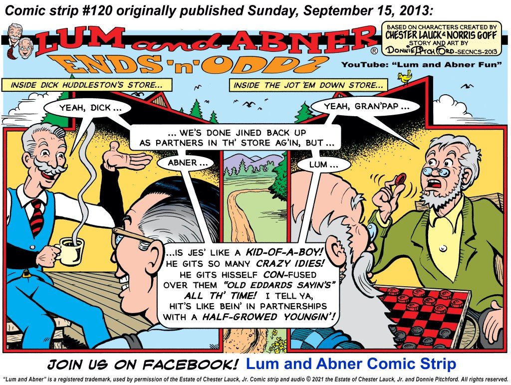 Around this time in 2013, I was preparing to edit the first book collection of Lum and Abner comic strips. I wanted an image for the front and back covers. Michael Ambrose, my editor over at Argo Press (non-L&A publication) suggested it might be a good idea to produce some strips to introduce newer readers to some of the history of Lum and Abner. Additionally, I had some one-shot strips in mind, so I decided to start a series called “Ends and Odds,” alternating a page on Lum and Abner history and/or character studies with one-page gags. A strip you will see soon provided the image I wanted for those book covers,