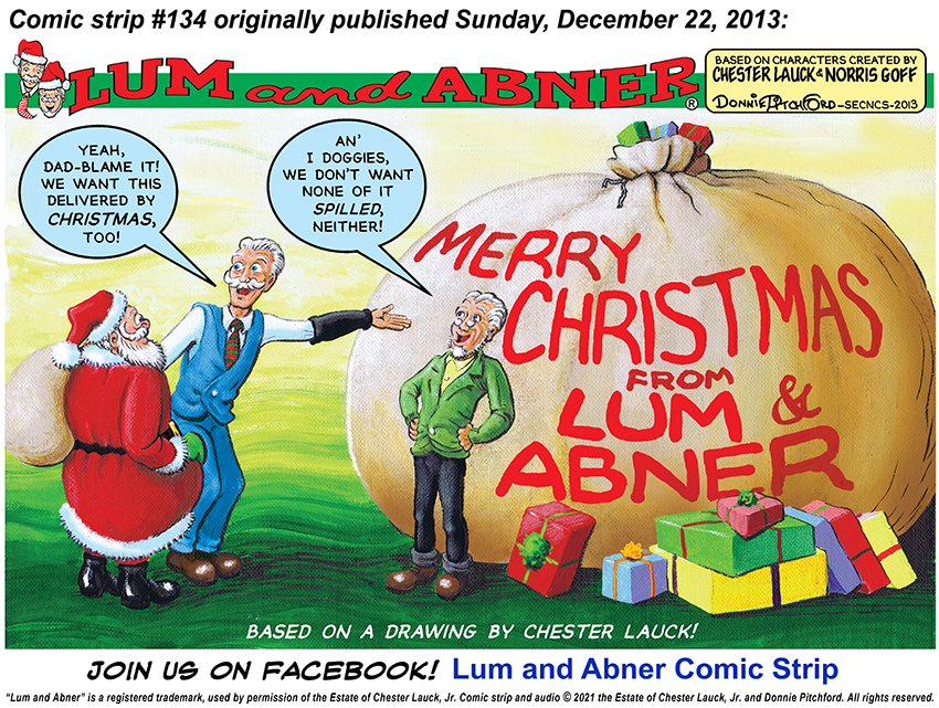 Today we present the third Christmas comic strip in the Lum and Abner series originally published in 2013! This time, the image is based on a cartoon by Chester Lauck from the 1930s! The character design is my own, to reflect that of the ongoing comic strip. Rather than pen and ink, I opted to paint the image in acrylics on canvas board. Special music is again performed by Marc Ridgeway!
