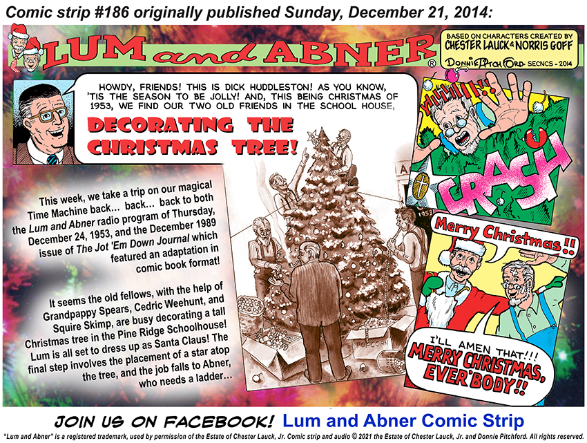 Our fourth Christmas comic strip in the Lum and Abner series was originally published in 2014! That year, we took you back to Christmas Eve 1953 for the misadventures of Lum and Abner attempting to decorate the schoolhouse Christmas tree! The illustrations were produced in 1989 for a comic book-style adaptation published in The Jot ‘Em Down Journal by The National Lum and Abner Society. Special music is again performed by Marc Ridgeway!