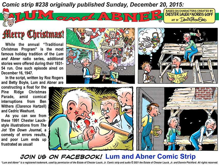 It’s time for our fifth Christmas comic strip in the Lum and Abner series! Today’s entry was originally published in 2015! As you will read below, this strip is based on a Christmas-themed Lum and Abner broadcast from 1947. The illustrations were produced in 1991 for a printing of that radio script which was published in The Jot ‘Em Down Journal by The National Lum and Abner Society. I chose to base the style of the drawings on that of Chester Lauck as he drew the characters in 1932.
