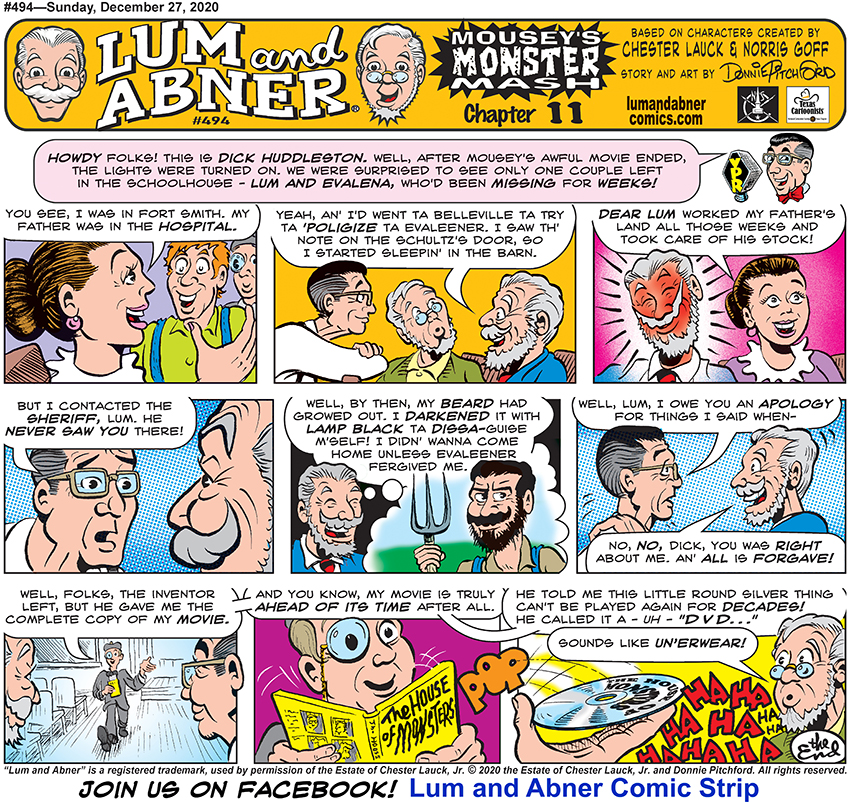 At this point, the Lum and Abner comic strip entered the year 2021, when we celebrated both the 90th anniversary of the radio program and the 10th anniversary of the comic strip! Click “Next strip!” to start that story!