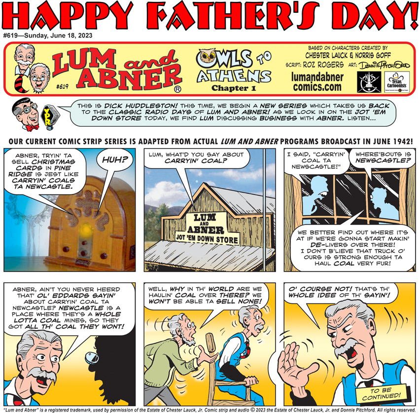 EXPLANATION: This series gets us back to Lum and Abner’s classic radio show by adapting a few of my favorite episodes! My friend David Miller coined the term “Abner’s Doubletalk Routines” for the many times Abner reacted to Lum’s “Old Eddards Sayin’s,” and “Owls to Athens” is likely my favorite (although others are equally funny)! Each week, you’ll hear a segment from the original 1942 broadcasts as we adapt them to comic strip form.