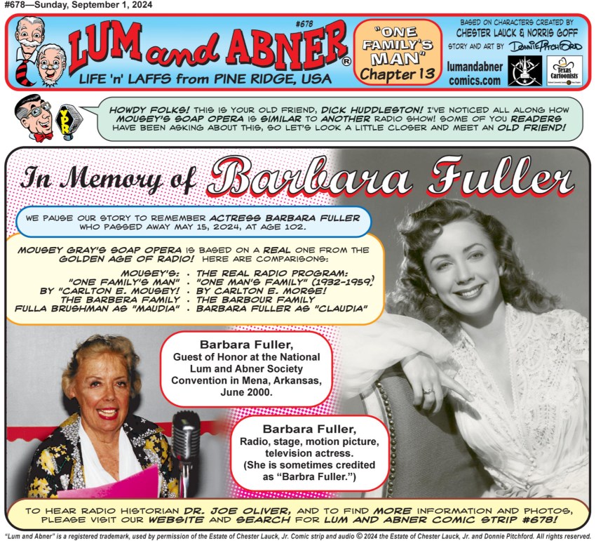 Actress Barbara Fuller, sometimes credited as Barbra Fuller, was the National Lum and Abner Society Convention Guest in June 2000! While she never worked with Lum and Abner, she did co-star on The Opie Cates Show on ABC Radio! Written by Lum and Abner head-writer Roswell B. Rogers, the show starred the comical-musical genius Opie Cates who is remembered by Lum and Abner fans as the leader of the orchestra and supporting actor during much of their half-hour series on CBS! A supporting player in The Opie Cates Show was famed silent movie actor Francis X. Bushman as Barbara’s dad and Opie’s boss! Our comic strip character Fulla Brushman is based on Barbara, with her name being a triple pun on Fuller, the old Fuller Brush Man salesmen, and Francis X. Bushman! (Yeah, this is deep, folks!)