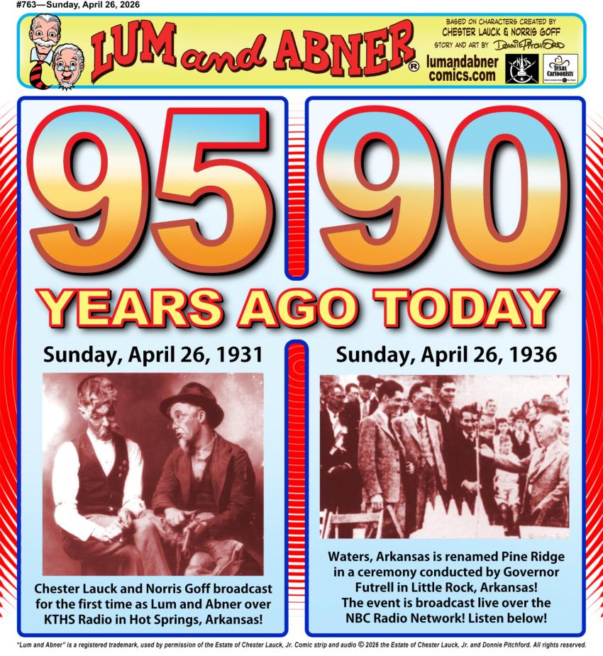 95 years ago today, Lum and Abner debuted on radio! We don’t have a recording of that, but 90 years ago today, Waters, Arkansas became Pine Ridge! Click below to listen to the historic 1936 name-change ceremony broadcast by NBC Radio! Hear Chet Lauck and Tuffy Goff, plus the only known recordings of the real Dick Huddleston and Cling Wilhite of Pine Ridge! Thought to be lost, this recording was rescued by Sam Brown of the National Lum and Abner Society in 1992!
